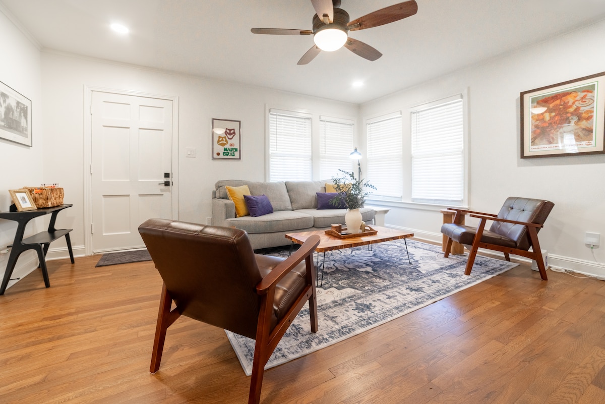 TV i varje rum. Välkommen till Art House! Från det ögonblick du öppnar dörren välkomnas du av en spegelsal inspirerad av kung Ludvig XIV, slottet i Versailles. Ett boende med galleritema med regionala konstnärer. Badad i varmt, dimbart ljus, med sekelskiftesspeglar, antika breakfronts, överdimensionerade lampor och ett marockanskinspirerat spa, komplett med eukalyptus epsom salt och lavendel bubbelbad. Bänkskivor i granit. Upplev Louisianas unika kultur med oss och koppla av utan reservation!