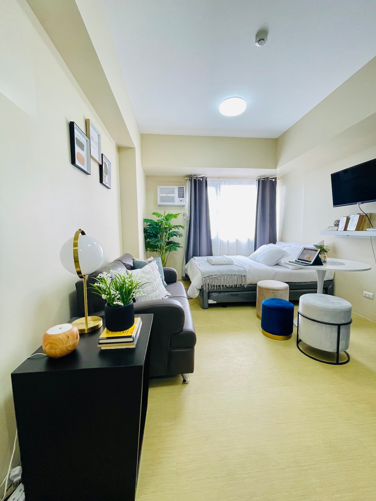 Lägenheten ligger inom gångavstånd till restauranger, affärer, ett sjukhus och Ayala Mall. Omgivningen är säker. Det finns 24 timmars övervakning och personal i lobbyn. Det finns en hiss i byggnaden. Interiören i studiolägenheten är mysig och bekväm. Den levereras med 2 dubbelsängar. Det kan vara värd för upp till 3 gäster. Internet WIFI tillhandahålls — perfekt för internetsamtal och webbsurfing.