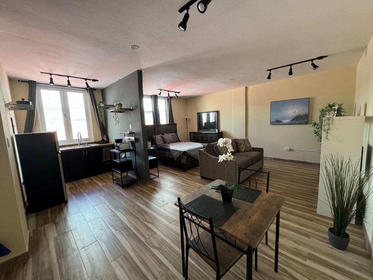 Fly till en mysig lägenhet med utsikt mot bron i en byggnad från 1942, belägen på den ikoniska Calle Progreso. Njut av samhället, vågorna och vackra solnedgångar. Nära restauranger, bagerier och all lokal charm. Perfekt för arkitekturälskare, surfare, äventyrare och de som söker lugn medan de utforskar den västra delen av ön.