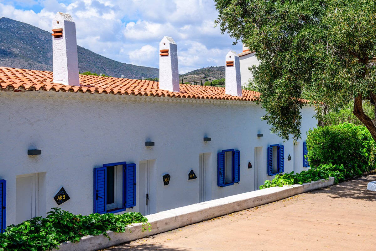 Ett charmigt hus beläget i en stor trädgård omgiven av olivträd, med en magnifik havsutsikt från huset och terrassen. Ett litet paradis för att koppla av och vila, perfekt för föräldrar och barn, 5 minuters promenad från stränderna. Mycket bra wifi-anslutning. Massor av köksredskap. Möjlighet att parkera flera bilar.