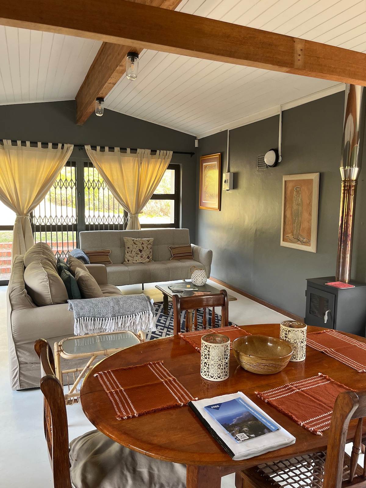 Tugela blandar en samling botaniska, djurliv och fågeltryck, bambu och öppna balktak, vävda afrikanska korgar, gräs-lampa ljuskronor, färgglada indiska bomulls överkast och kuddar, med ljusa väggar och texturerad väggpapper för att ge detta boende en underbart avslappnad, men ändå sofistikerad, känsla. Stor trädgård med pool och vidsträckt utsikt över de omgivande bergen. Avskilt och fridfullt. En familjehelgedom i hjärtat av Franschhoek.
