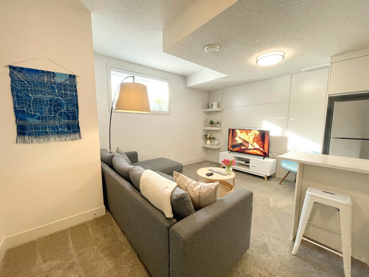 Completely self-contained 1-bedroom suite with separate entrance and all the comforts of home. Enjoy a full kitchen (dishwasher, stove, microwave), gas fireplace, open-concept living, patio & small yard. Comfortable queen bed, spacious 4-piece bath. Workspace with WiFi, convenient in-suite laundry, off-street parking. Legal secondary suite with dedicated heat and ventilation. Perfect for professionals or couples. Quiet residential neighborhood near Fish Creek Park, close to shops & amenities.