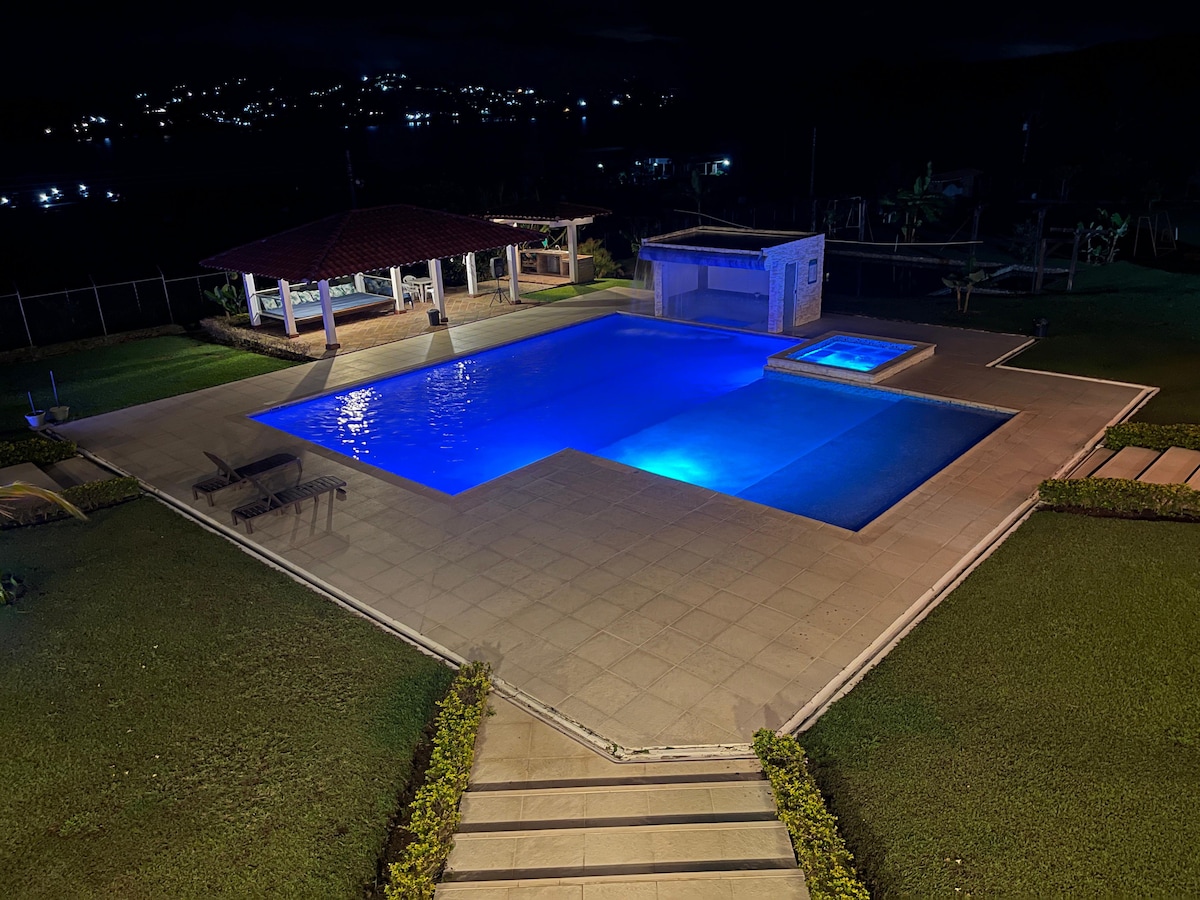 Disfruta del fácil acceso a tiendas y restaurantes populares desde este encantador lugar para hospedarte. contamos con 🏊 Piscina ♨️ Jacuzzi 🌅 Vista al lago 🎣 Pesca deportiva (costo aparte) ⚽ Cancha de fútbol 🎮 Salón de juegos ( mesa de billar, sapo, mesa de hockey) 🚗 Parqueadero privado 🥘Cocina totalmente equipada con los utensilios necesarios