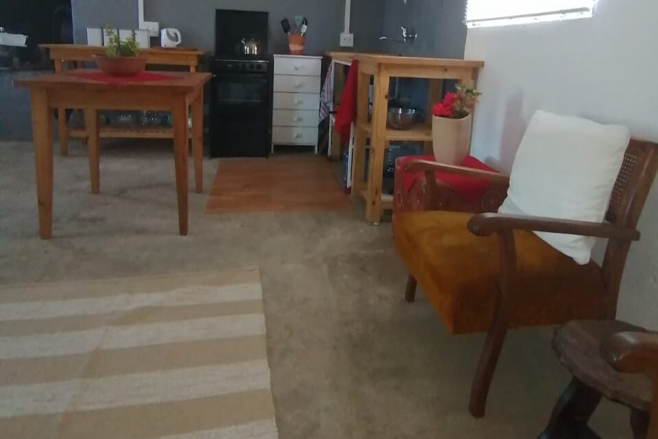 Detta hus har ett sovrum utrustat med en queensize-säng och bäddsoffa. Två till tre personer kan sova här. Max 2 vuxna. Det har ett fullt utrustat badrum och ett kök i öppen planlösning med ett vardagsrum och öppen spis lämplig för en braai. Stoep uteplats. Utomhus braai. Djurvänligt.