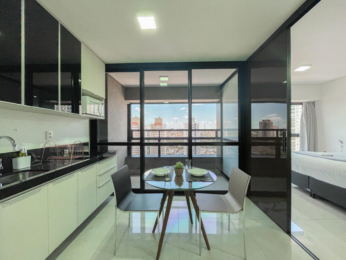 Modern studio i Jardim dos Estados, med panoramautsikt och komplett struktur. Rymmer upp till 4 personer (queen bed + bäddsoffa), har luftkonditionering, 300 mbps Wi-Fi, utrustat kök, två Smart TV och privat täckt garage. I byggnaden: uppvärmd pool, oändlig pool, torr bastu, fitnesscenter, co-working, spelrum och tvätt (betald användning). Concierge dygnet runt, panoramahiss och massor av komfort på en av de bästa platserna i staden.