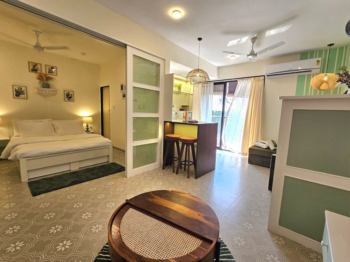 Modern Boho Apartment | Minuter från North Goas stränder. En mysig, fullt möblerad 1BHK retreat på bottenvåningen perfekt för par, vänner eller små familjer. Höjdpunkter: - Snygg Boho-inredning med en varm atmosfär - Luftkonditionering i sovrum och vardagsrum för komfort - Smart-TV + höghastighets-WiFi - Utrustat kök med RO-vatten, spishäll, kylskåp och tvättmaskin - Delad pool (09:00–18:00 | badkläder obligatoriska - Gym på plats tillgängligt för 200 INR per person och dag - Säkerhet dygnet runt - Gratis parkering