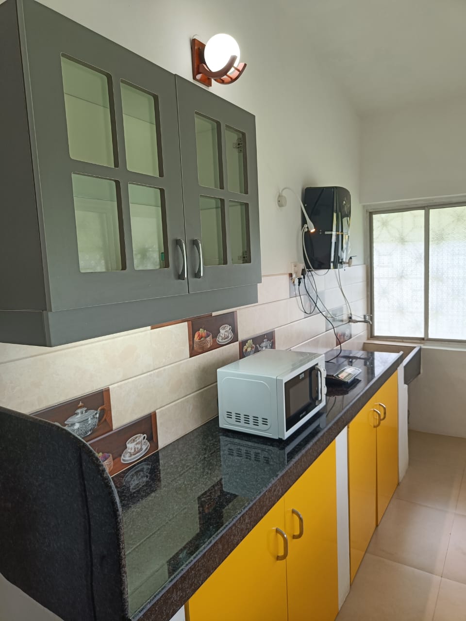 Meditation, mental lugn och klarhet var vårt huvudfokus när vi skapade detta vackra utrymme. Byggt i en sexkantig stil, är det ett utrymme som omedelbart lugnar, lugnar och fräschar upp hela ens väsen. Omgivet på alla sidor med gamla Goan stil fönster som har utsikt över trädgården, är detta utrymme perfekt när man vill ladda och föryngra. Jag har också satt upp ett skrivbord. Jag har designat ett mycket Zen stil öppen plan trädgård kök med en fantastisk bambu spår som en bakgrund.