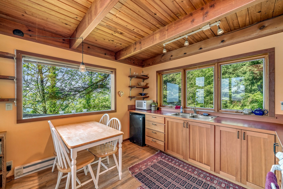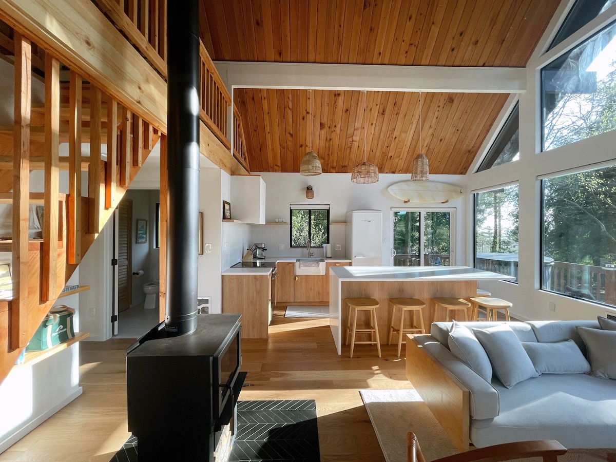 Vår stuga i surfstil må vara liten, men de stora fönstren med utsikt över bukten, havet och kustskogen kan mycket ljus översvämma utrymmet. Bara en kort promenad till stranden, butiker och nära några av norra Oregons bästa surfplatser. Njut av dimmiga morgnar i bubbelpoolen, äventyr under dagen och tillbringa solnedgångar vid eldstaden eller på vår stora altan. Vår trädgård har också ett spår, så ta med några äpplen — chansen är stor att du ser en hjort eller två :) @surflineloft STVR#851-24-000045