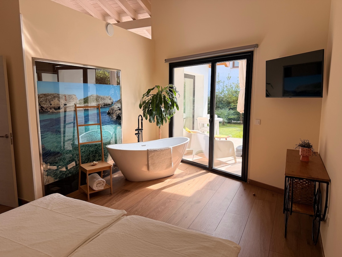 Lägenhet på bottenvåningen med vacker och solig trädgård, privat terrass med allt du behöver för att vila. Fullt utrustat modernt kök i ett öppet utrymme bredvid vardagsrummet, stora fönster med direkt tillgång till trädgården. Rymligt badrum med dusch. Rymligt rum med extra stor säng, stora fönster och inbyggt badkar för dina stunder av avkoppling, direkt utgång till trädgården. Strålande golv för vinterdagar. Privat parkering.