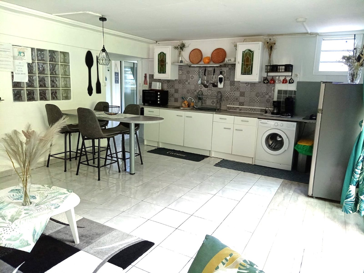 Modern studio med liten privat terrass i en grön oas på 950 m2. Den luftkonditionerade stugan, helt oberoende, tillgänglig via tre trappsteg, har utsikt över poolen som värms upp av solpaneler. Gratis Wi-Fi, sängkläder ingår. Beläget i ett lugnt bostadsområde, tillgången är enkel och snabb. Möjlighet att parkera framför huset. Tillträde till stugan sker via en omfartsallé och en oberoende grind.