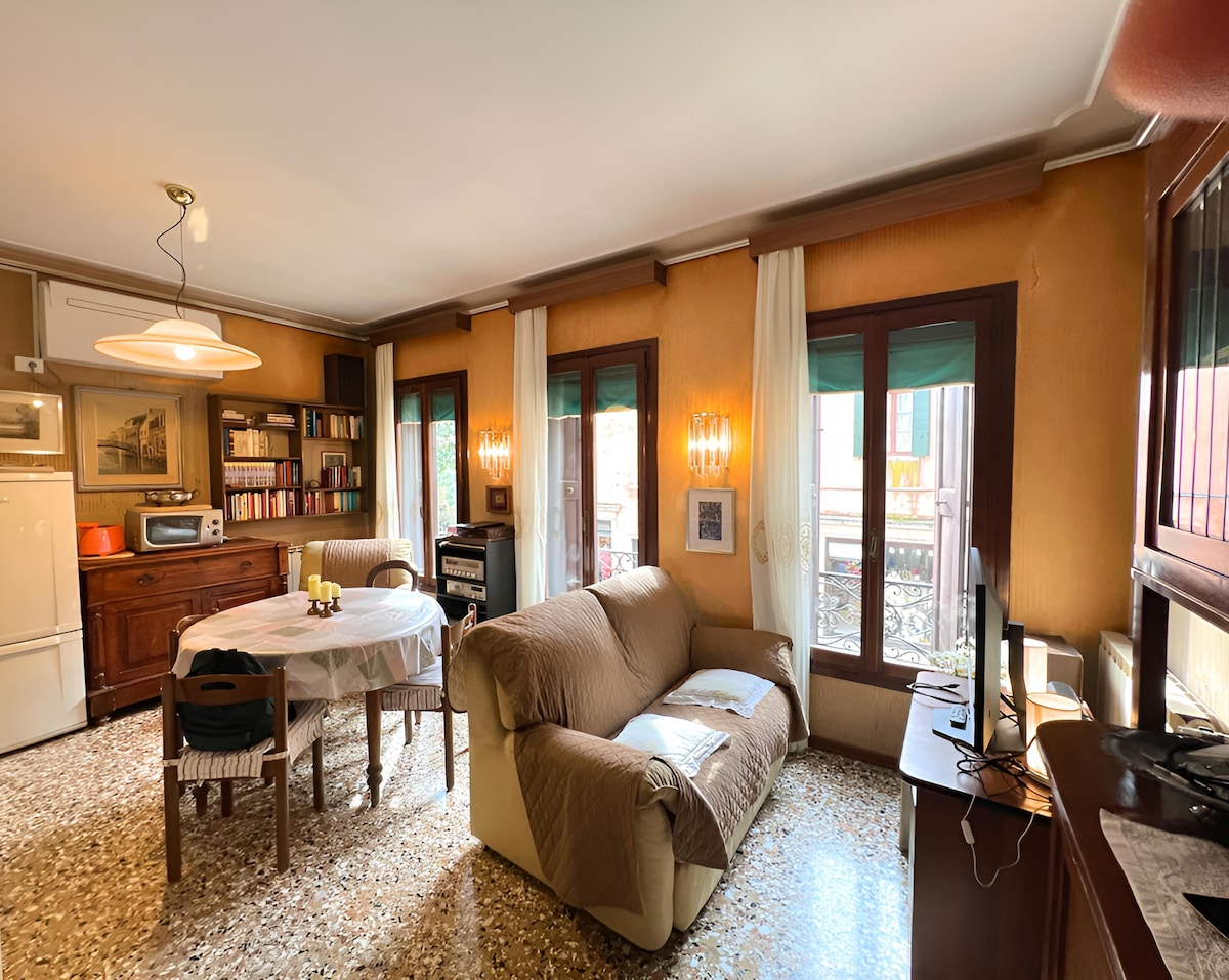 Föreställ dig en lägenhet som påminner om en romantisk båt försiktigt förankrad till kanalen nedanför. Dess maritima möbler och nautiska accenter skapar en verkligt unik atmosfär. Från fönstren kan du beundra järnbron "Ponte dell'Acquavita" och en glimt av lagunen. Beläget i ett lugnt område, långt från turistmassorna, erbjuder det äkthet och lugn, men det är bara 14 minuters promenad från Piazza San Marco. En venetiansk tillflyktsort som blandar magi och lugn