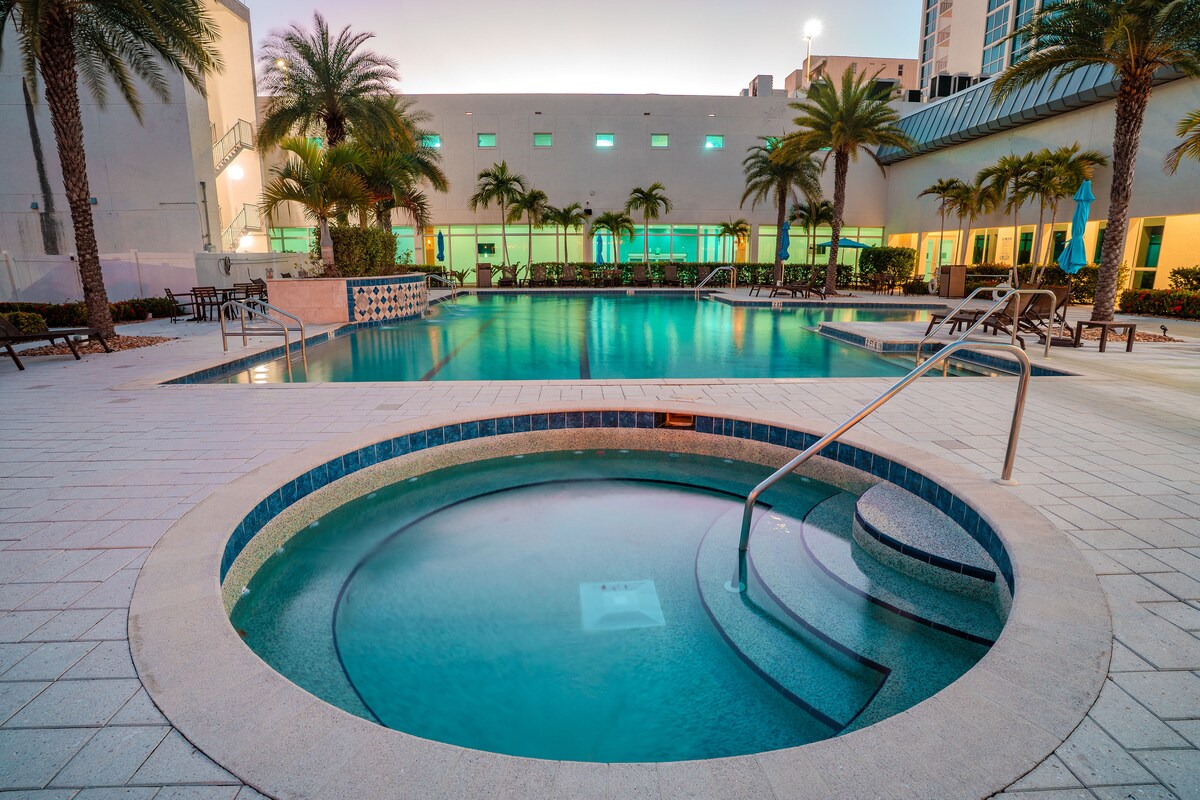 Välkommen till Level 19, en modern tillflyktsort på 19: e våningen i Downtown Fort Myers. Njut av vacker utsikt över stadssilhuetten, varm inredning och ett fullt utrustat kök. Koppla av i vardagsrummet med Queen bäddsoffa och koppla av vid poolen, badtunnan eller gymmet. Denna svit med dubbelsäng är utformad för komfort och är värd för upp till fyra gäster. Utsikt över staden | Pool | Bubbelpool | Gym | King-säng | Queen bäddsoffa | Wi-Fi | Smart TV Restauranger: 2–5 minuters promenad | Edison & Ford 5–10 min | Fort Myers Beach 25–30 min | RSW 25 min