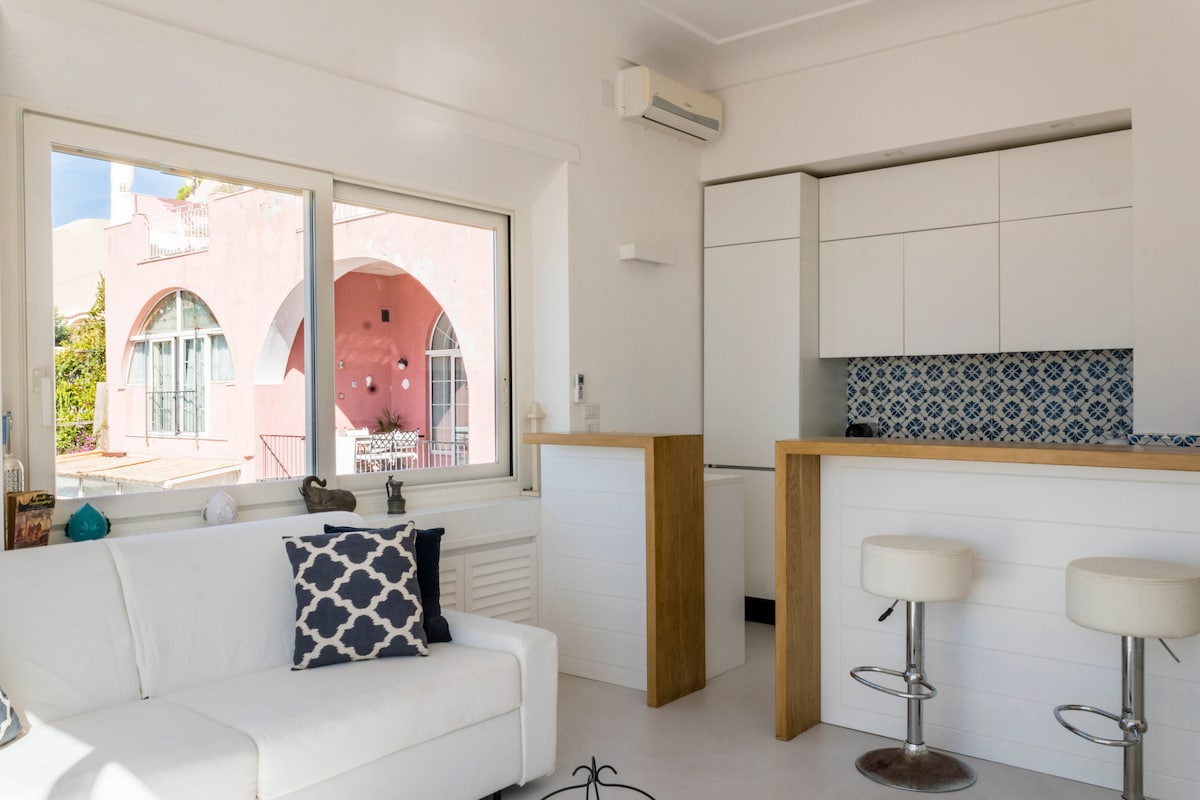När du väl landar på ön tar det bara tre minuter att gå till lägenheten. Mycket nära lyxiga yachthamnen och hamnen. Lägenheten har en rymlig terrass med utsikt över havet, Neapelbukten, Vesuvius, Sorrento, Ischia och Procida. Stranden ligger några minuter bort och närliggande transport gör det enkelt för dig att resa runt på ön.