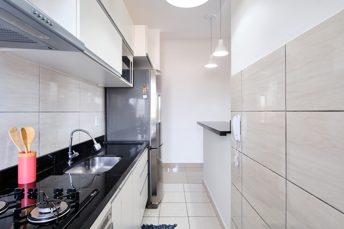 Perfekt lägenhet för ett par, för upp till 4 personer, inklusive barn Rum med 1 queen-size säng. Det finns en extrasäng, enkel eller dubbel (Kenko), för vardagsrummet Wi-Fi, Smart-TV och luftkonditionering i sovrum och vardagsrum 01 parkeringsplats Incheckning 14:00 Utcheckning senast 11:00 Tillhandahåll data för åtkomstauktorisering. Vi erbjuder sängkläder och handdukar på begäran/mot en extra kostnad.