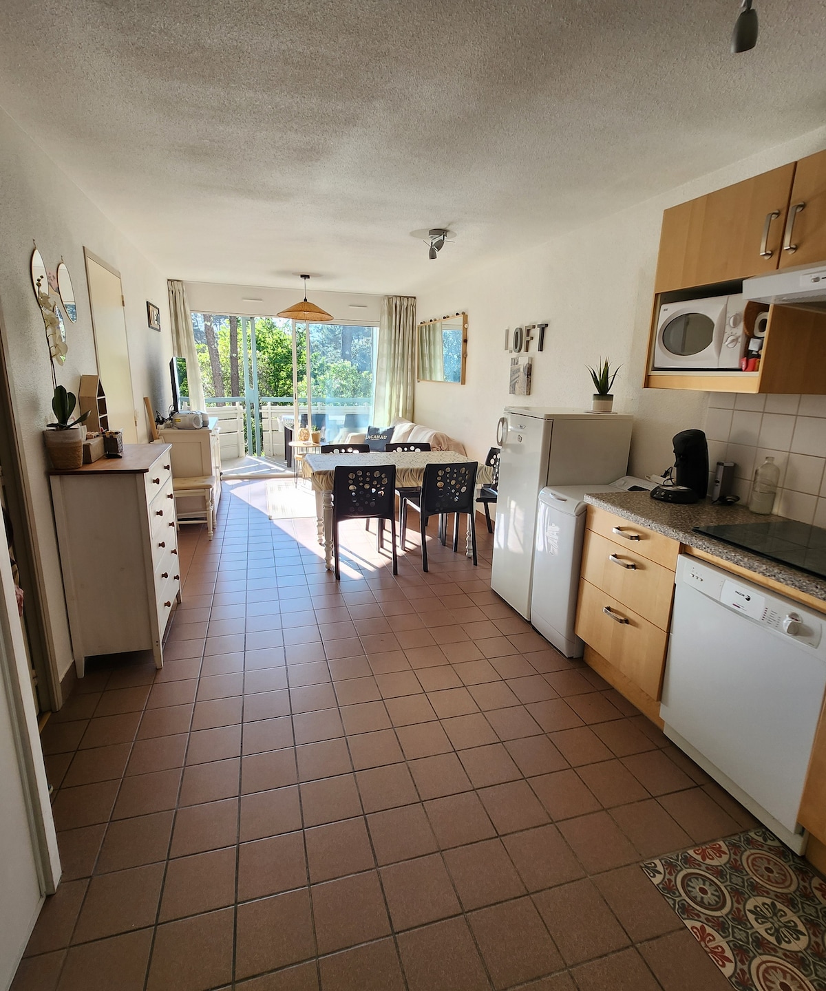 Huset ligger i Hourtin Port, i sjöns servade lägenhet, i mitten av en sluten och trädbevuxen park. Det har totalrenoverats för att erbjuda dig en kvalitetsservice. På en nivå är ytan 40 m2. Ett stort glasfönster öppnas direkt till terrassen i skuggan av ekarna (trädgårdsmöbler och paraply). Bostaden är inhägnad, poolen är öppen: 1 juni–30 september, lekplats för barn, boulebana, gym, grill, pingisbord.