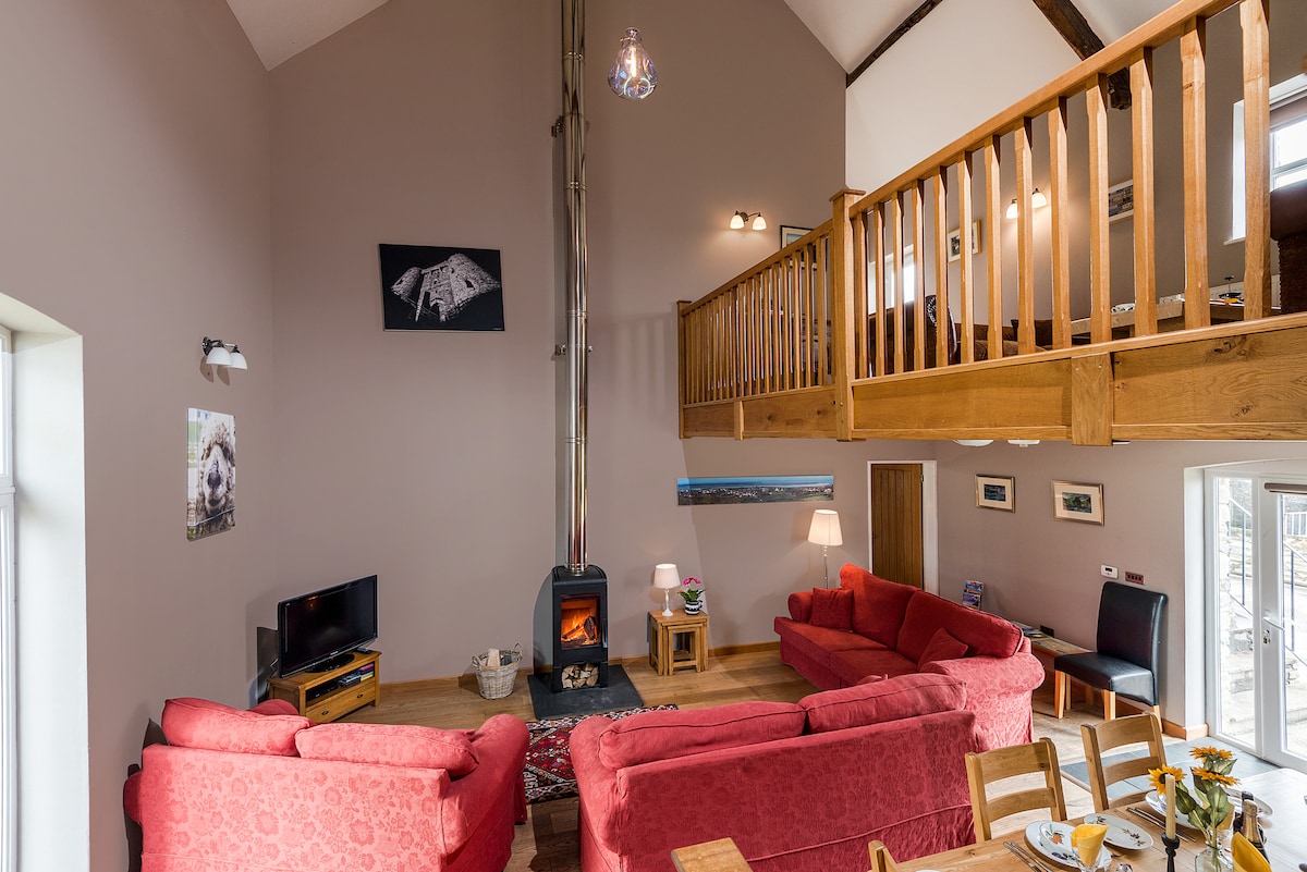 Unik fastighet eftersom Barn är helt privat. Uteplatsområden fram och bak med gräsmatta. Familjevänligt. Barn kan bygga sin egen lya och leka i den närliggande bäcken. Lyxig, fantastisk utsikt, avskild, parkering. Beläget på en 170 hektar stor gård så gott om promenader/stigar, stjärnskådning och fågelskådning. Sängkläder, handdukar, diskmaskin, tvättmaskin, mikrovågsugn, inbyggt kylskåp och frys också en fristående kylskåp frys, ugn och spishäll, tillgång till ved för vedeldad brännare. OBEGRÄNSAT WIFI (DOLD URL)