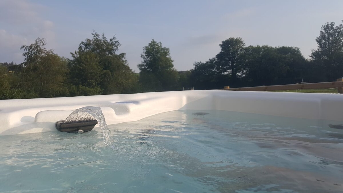 Avskild stuga med bubbelpool, utsikt över landsbygden och pool