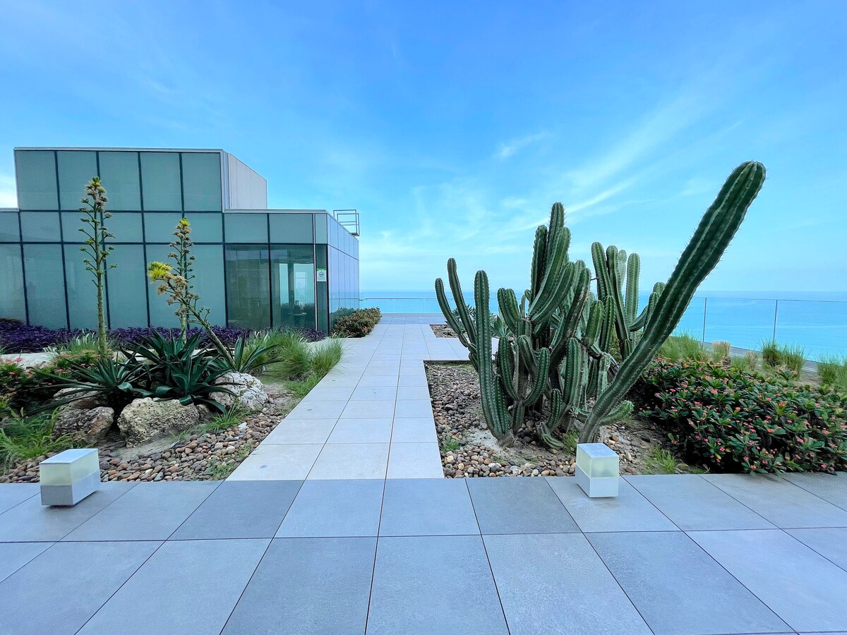 Vakna till vågornas ljud i denna spektakulära lägenhet vid havet i Serena del Mar, Cartagena. Njut av panoramautsikt från en stor balkong med en hängmatta. Detta moderna och mysiga utrymme i Morros Zoe-byggnaden är idealiskt för en oförglömlig semester, perfekt för par eller små familjer. Direkt tillgång till stranden, poolen och gymmet.