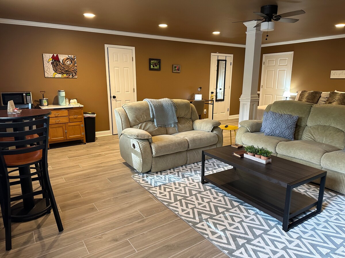 Mys på Little Farm vid foten av Appalacherna. Perfekt för par och resande proffs, vår privata källare har en separat uppfart och ingång, dubbelsäng och fullt badrumsbad. Bekväm liggande loveseat och soffa, 70" HD smart TV med soundbar med Netflix och Amazon Prime, WIFI, kylskåp, mikrovågsugn, kaffebar med Keurig Coffee Maker och bistrobord. Utanför njuter du av Little Farms utsikt över vår flock under vackra Magnolia komplett med eldstad och glidflygplan.