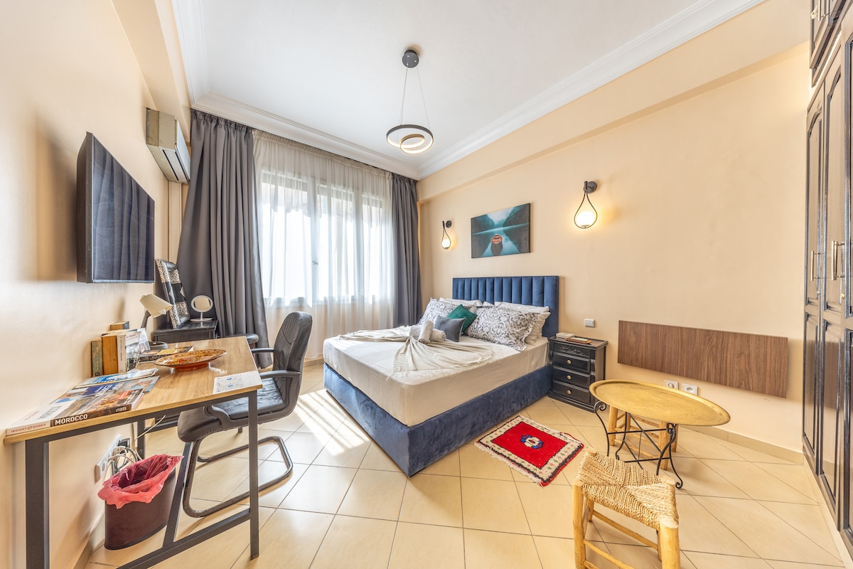 ✨ Elegant tillflyktsort i hjärtat av Casablanca, mittemot tågstationen Casa Port. Denna ljusa och rymliga lägenhet på 83 m² erbjuder all bekvämlighet du behöver för en perfekt vistelse och rymmer bekvämt upp till 5 gäster. Här finns 2 fridfulla sovrum med utsikt över trädgården, ett vardagsrum i hemmabio-stil (75" TV), en balkong med utsikt över Hassan II-moskén, ett fullt utrustat kök och en dedikerad arbetsyta. Perfekt för avkopplande stunder, oavsett om det är för en helg eller en längre vistelse 🌇🌿