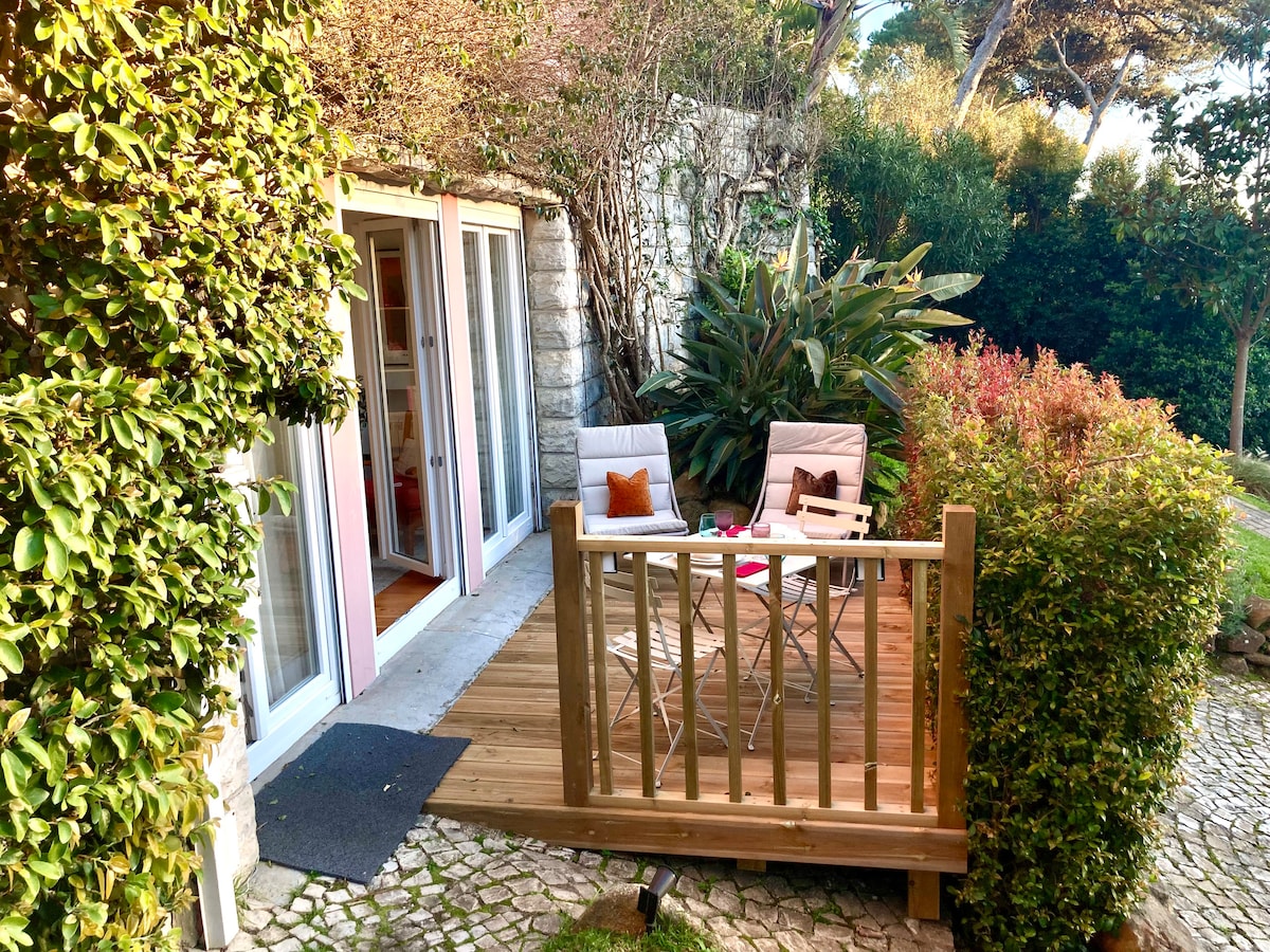Koppla av i en lägenhet vid stranden omgiven av fridfull natur med fantastisk havs-/bergsutsikt. Varför du kommer gilla det: - Havs-/solnedgångsutsikt - Rymlig pool omgiven av frodig grönska - Stor ekologisk trädgård med färska grönsaker, örter och teblad - 12 minuters promenad till stranden Guincho (1 km bort) - Egen uteplats med matbord utomhus - Beläget vid ett naturreservat med natursköna promenadstråk - Bara 2 minuter från topprankade restauranger och autentisk, prisvärd lokal mat - Snabbt wifi på 200 Mbit/s