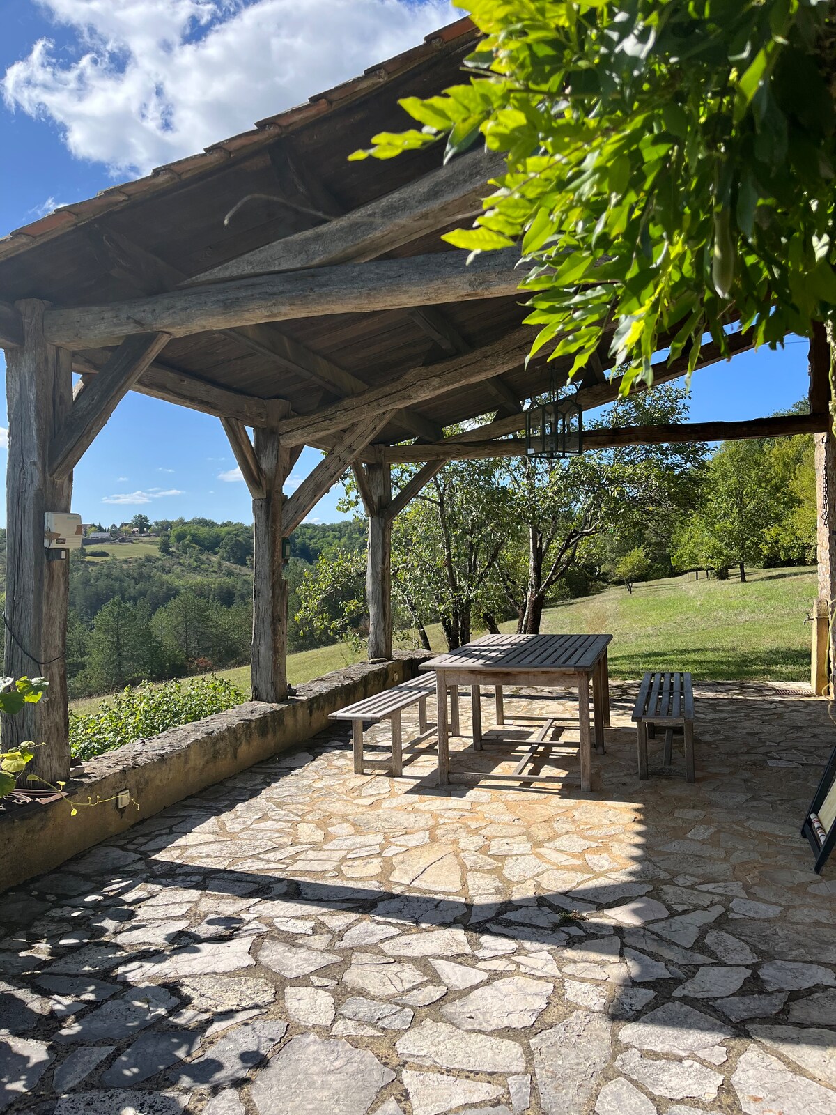 Välkommen till vårt underbara lanthem inbäddat i böljande, skogiga kullar. Njut av en exceptionell 180° utsikt över Dordogne medan du simmar i vår oändliga pool (öppen endast maj till oktober) eller bubbelpool (tillgänglig året runt). Vår fastighet ligger på 4 hektar lugn landsbygd högst upp i de gröna Dordogne-dalarna. Luta dig tillbaka, ta ett glas vin och titta på luftballongerna som färgar himlen vid soluppgången eller solnedgången. Använd våra cyklar för att utforska platsen eller grilla utomhus och njuta av landskapet.