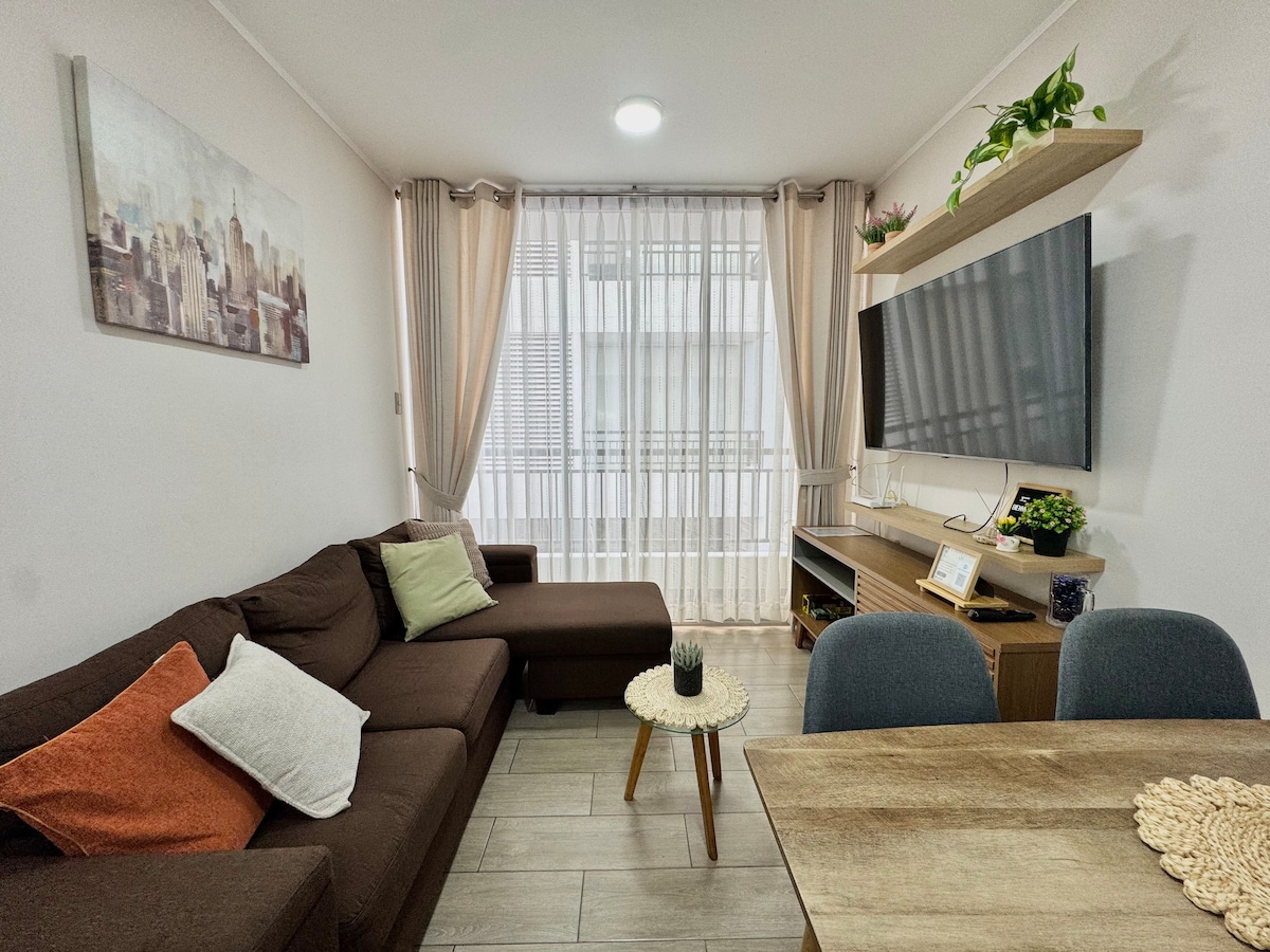 Disfruta de una experiencia exclusiva en este moderno departamento ubicado en el Condominio Palmeras, un espacio diseñado para quienes valoran el lujo, el estilo y la comodidad. -Sala amplia con diseño elegante y vista al condominio. -Cocina equipada con electrodomésticos modernos. -Dormitorios con excelente iluminación natural. -Baños con acabados modernos. -Seguridad las 24 h. del día. -Cochera disponible de noche previa reserva. -A solo 5 minutos del aeropuerto, con fácil acceso.