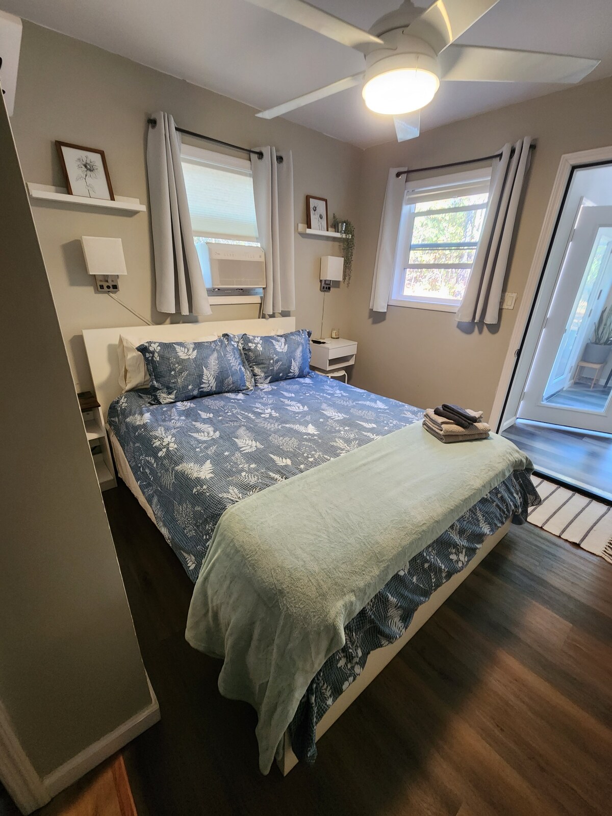 Studio belägen på privat skogsområde 20 tunnland med 800 kvadratfot utrymme, tillverkat med återvunnet material trä och metall. Stort däck med utsikt över 7 hektar sjö med brännskåra. Egen ingång med elektrisk öppen spis, TV, musik, dubbelsäng, soffa, bar med pallar, kylskåp, 2 brännare matlagningsyta, mikrovågsugn, Keurig, brödrost, tallrikar och köksredskap. Eget badrum med komposttoalett, dusch och handfat. Tillgång till paddelbåt med flytvästar finns. Fiskespön om du vill prova det!