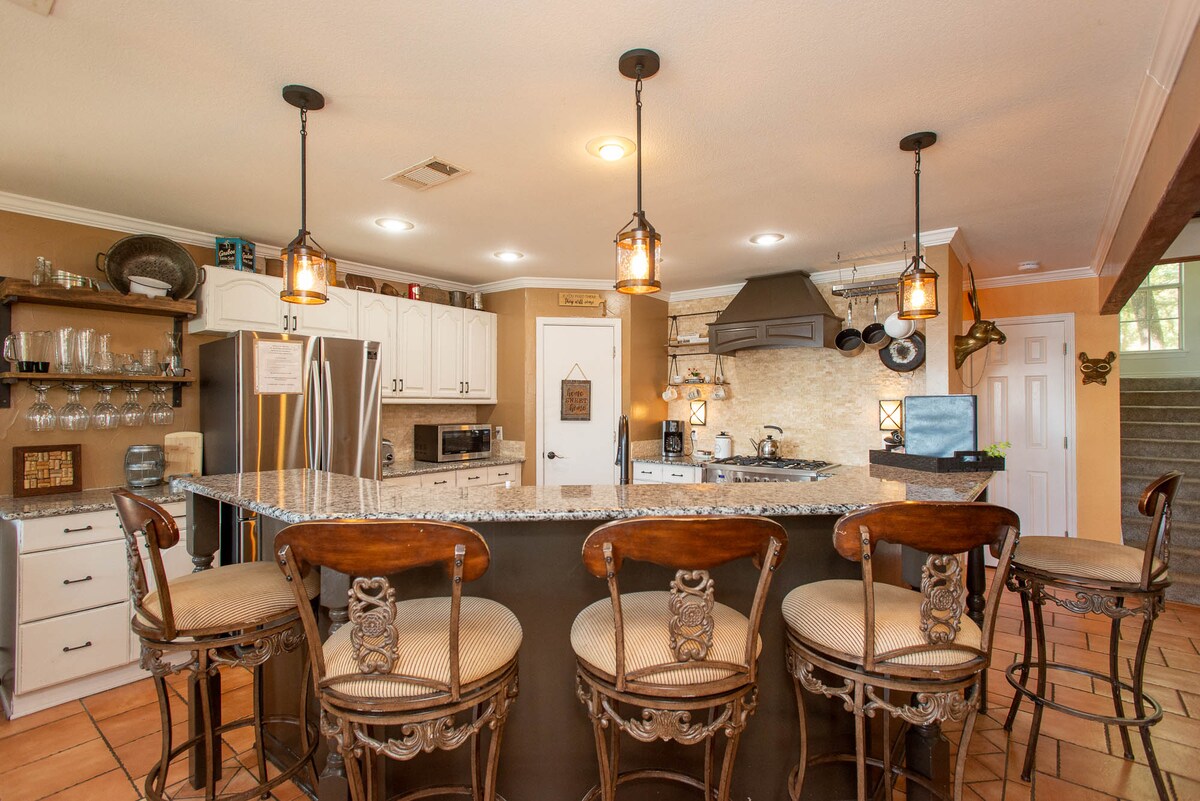 "Sunshine & Whiskey" är ett hem med 3 sovrum/2 badrum (sovplats för 8) Bekvämligheter inkluderar: Bubbelpool, Firepit, Biljardbord, Air Hockey, Grill, Foosball, Shuffleboard, Ping-Pong och mer – ligger bara fem minuters promenad till Cedar Creek Lake. Tillräckligt med utrymme för 8, men inte för stort för ett par. Detta genomtänkta hem är lika bekvämt och det är roligt. Oavsett anledningen till ditt besök kommer din tid att vara väl spenderad!