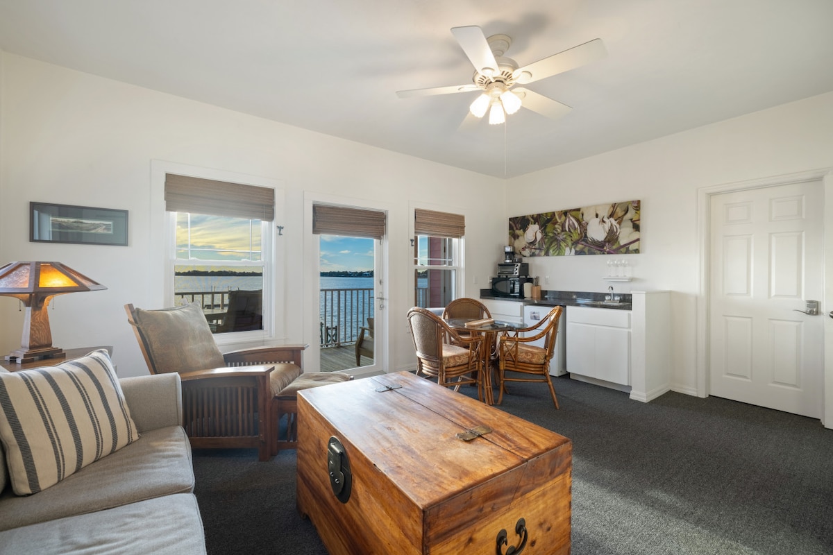 Sunset Suite ligger precis ovanför kusten och är en ljus och fridfull studiolägenhet med svepande utsikt över golfen från din privata balkong. Denna tillflyktsort på översta våningen är perfekt för gäster som vill koppla av till rytmen av tidvattnet och njuta av Cedar Keys ikoniska solnedgångar. Oavsett om du är här för att koppla av eller utforska, erbjuder Sunset Suite komfort, bekvämlighet och en plats på första raden till ö-tid.