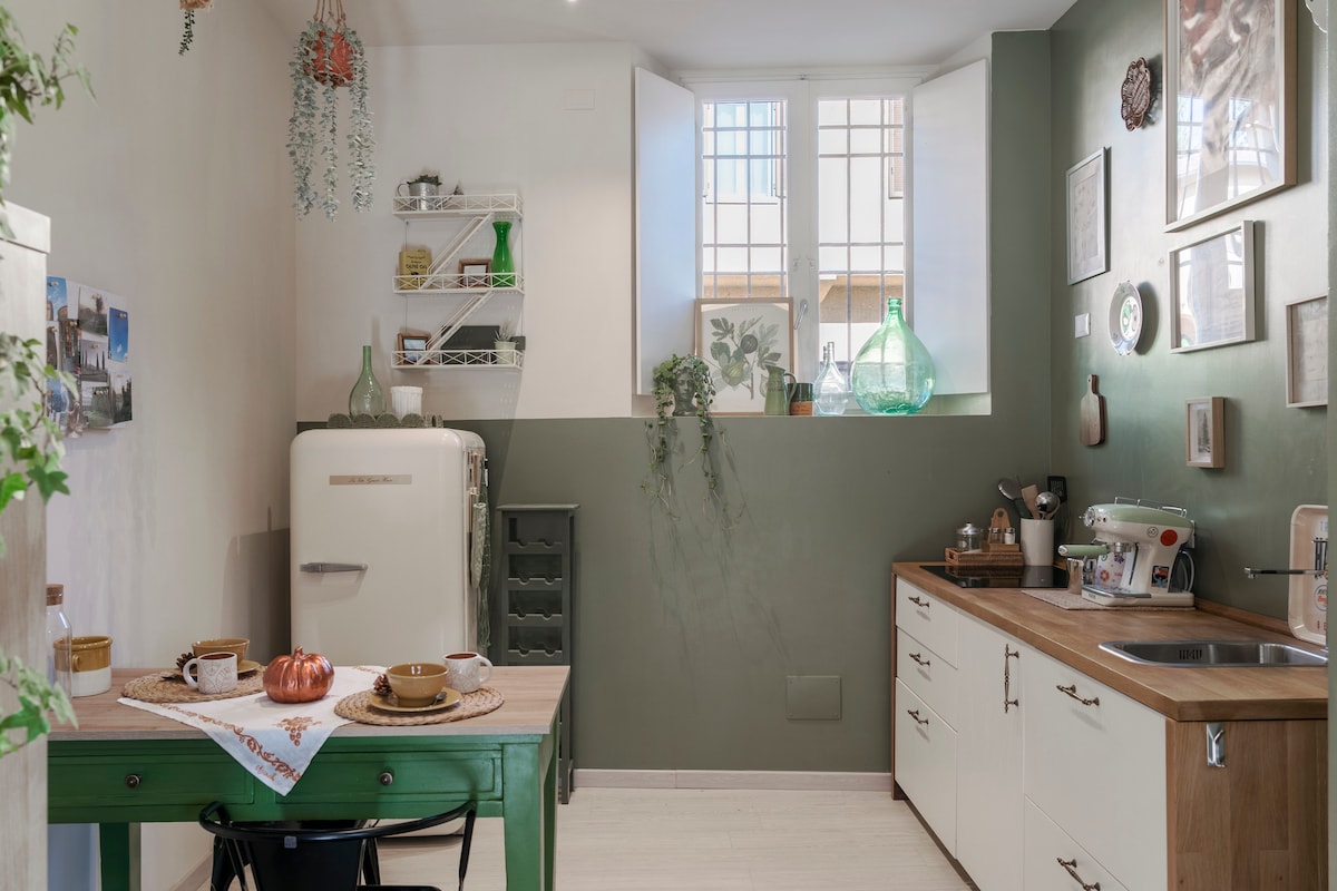Detta ljusa vindsutrymme är inrett med allt du behöver för en trevlig vistelse: ett rymligt kök med matlagningsredskap, en induktionsspis, en mikrovågsugn, en Smart TV, Netflix, Wi-Fi, en Bluetooth-högtalare, luftkonditionering, en tvättmaskin och en bekväm dubbelsäng under en fantastisk fresk från 1100-talet. Hela lägenheten finns på tredje våningen (ingen hiss), i stadens livligaste stadsdel, bara fem minuter från tunnelbanan.