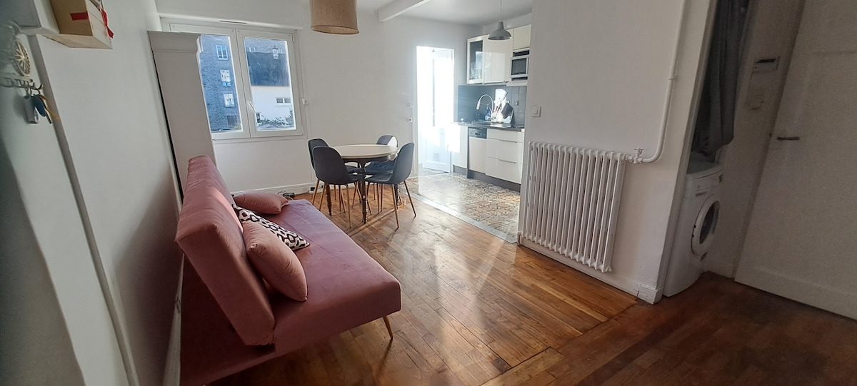 Denna moderna och bekväma lägenhet på 50 m2 ligger i hjärtat av Rennes historiska centrum. Den har nyligen renoverats samtidigt som den gamla charmen har bevarats. Belägen ett stenkast från järnvägsstationen, är den perfekt för dina turist- eller affärsresor. På första våningen i en säker byggnad ligger den i ett gammalt kloster från 1500-talet som kallas "Grande maison des Carmes" vars unika korgtrappa i Rennes är klassad som ett historiskt monument.