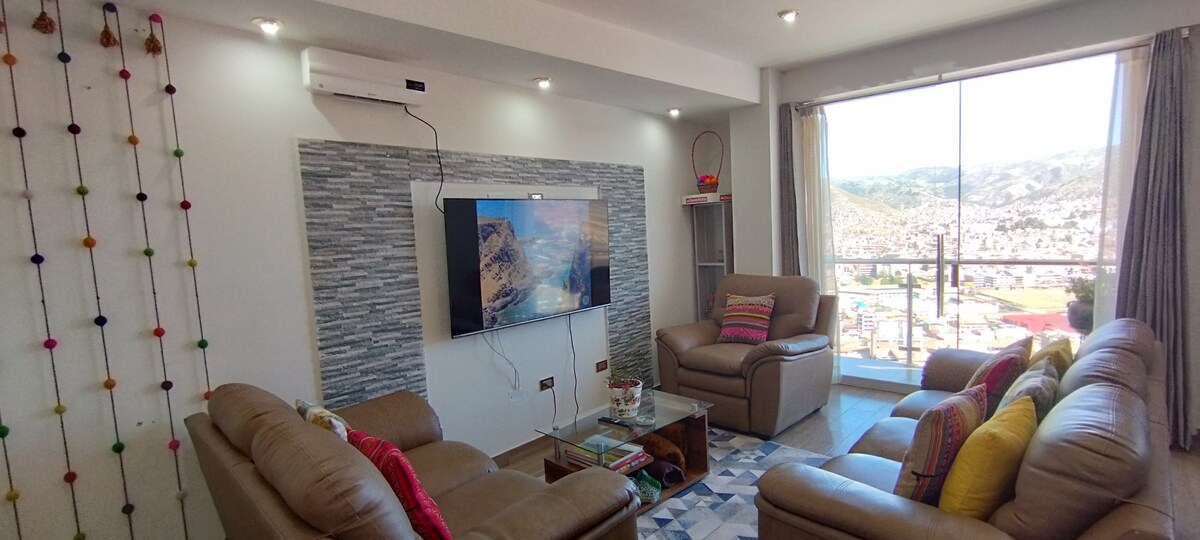 Mysig och rymlig lägenhet i Cusco med panoramautsikt. Perfekt för upp till 6 gäster, det har 3 sovrum med TV och värmare (tillval), 2 fulla badrum, vardagsrum, matplats, fullt utrustat kök, tvättstuga och WiFi. Varmvatten dygnet runt. Beläget på 5:e våningen (ingen hiss). Parkering finns tillgänglig. Bara några minuter från det historiska centrumet — perfekt för att njuta av Cusco i komfort och frid.