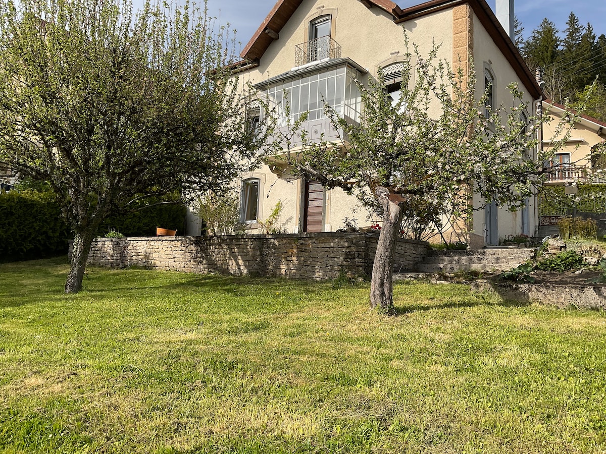 Rymligt familjeboende: 3 sovrum, 1 badrum, 2 kontor/extra sovrum möjligt, höghastighets WiFi. Fullt utrustat kök, mysigt vardagsrum, bibliotek, enorm trädgård & terrass. Idealiskt beläget i centrum: olika butiker, restauranger, hälsohus, apotek, veterinärer, biograf, pool, fritidsaktiviteter att göra till fots eller 5 minuter med bil! 1 timme från stora turistattraktioner i både Frankrike och Schweiz. //-- Sommarbonus (mitten av juni till slutet av augusti): Jacuzzi och utomhusspel! --//"