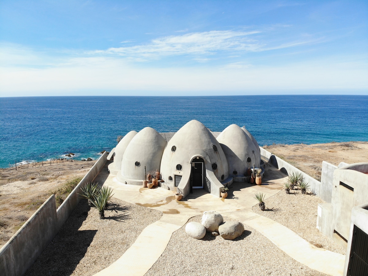 Denna antika utsiktsplats är kärleksfullt känd som "Dinosaur Eggs" för sin udda byggnadsstil, högt ovanför en privat strandvik, och var en samlingsplats för familjer med lokala fiskare som väntade på att deras nära och kära skulle återvända från havet. Med häpnadsväckande utsikt över Stilla havet, bara några minuter från Todos Santos, restauranger i världsklass och barfota barfota, ligger det mellan surf breaks i San Pedrito och Cerritos. Njut av episk valskådning från boendets enorma bakdäck, eldstad och infinity edge pool.