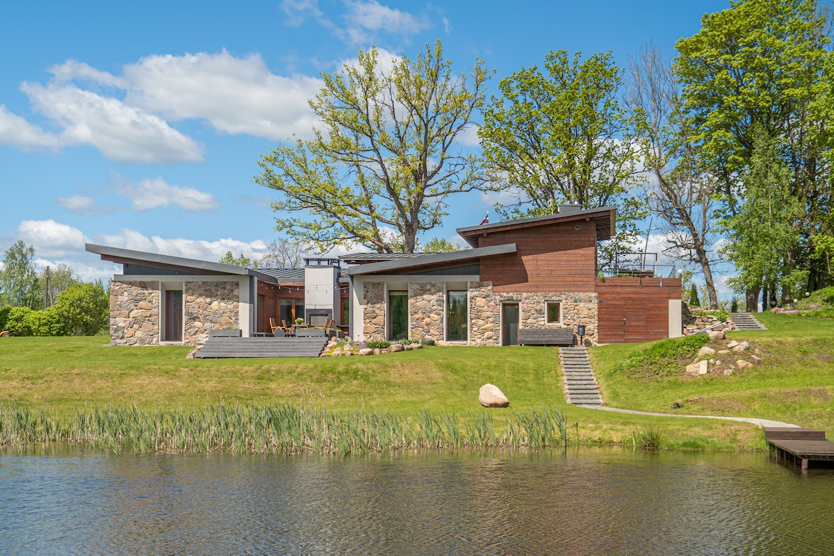 Mysigt hus vid sjön med privat sandstrand, bastu (extra avgift), roddbåt, SUP-brädor och lekplats för barn. Koppla av vid eldstaden, i hängmattor, eller fiska gädda och mer. Nautisk inredning, välutrustat kök, Wi-Fi, TV, luftkonditionering och badrum med golvvärme. Storkar, kaniner och ankor besöker ofta boendet. Den populära staden Sigulda ligger bara några minuter bort. Perfekt för familjer, par, sportfiskare och naturälskare! Boka nu för att njuta av din semester vid sjön!