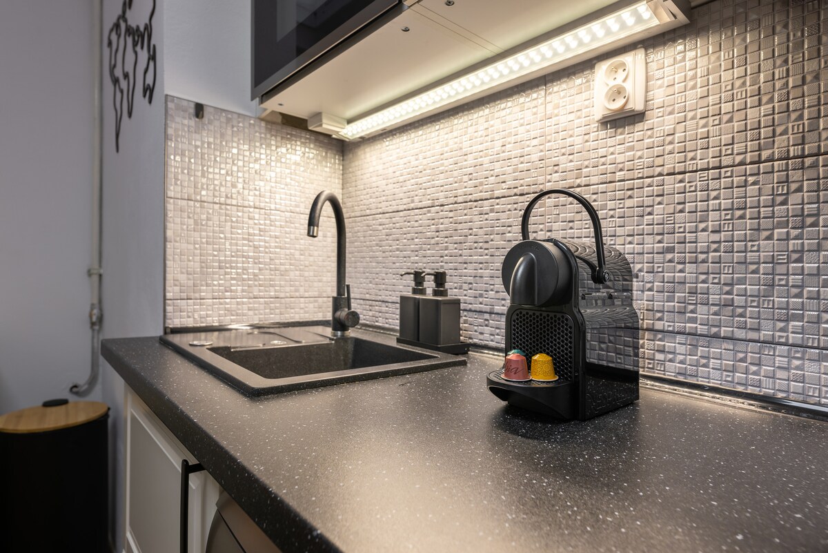 Denna mysiga, ljusa lägenhet ligger i hjärtat av Prags historiska centrum. Den består av två rum, inklusive en stor dubbelsäng, förvaringsenheter och ett kök med kylskåp, vattenkokare, bestick, diskmaskin och andra köksredskap. Det finns också ett privat badrum. Lägenheten är utformad i en mycket modern stil med trägolv och stora fönster med persienner. Allt du hittar inuti är arbetet av högt rankade designers som samarbetade för att inreda detta ställe.