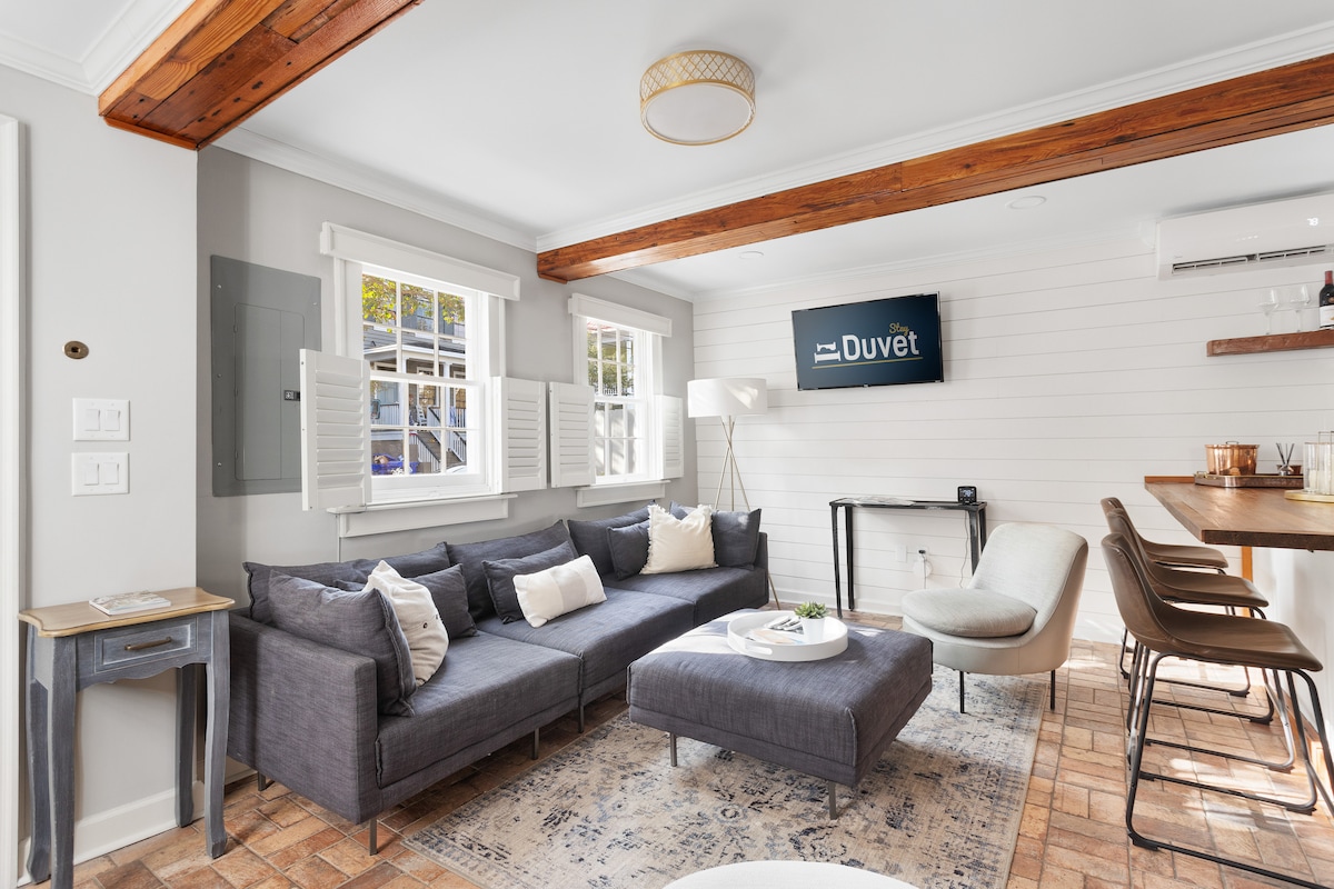 Bo i denna eleganta 2023 Fire Tower-lägenhet med ett sovrum med dubbelsäng och eget badrum, Smart-TV och fullt utrustat kök. Koppla av på den gemensamma takterrassen, terrassen eller innergården, allt bara några steg från King Streets butiker och restauranger. Njut av höghastighets-WiFi, lyxiga sängkläder, bekvämligheter i enheten och gratis parkering utanför gatan — perfekt för en Charleston-semester.