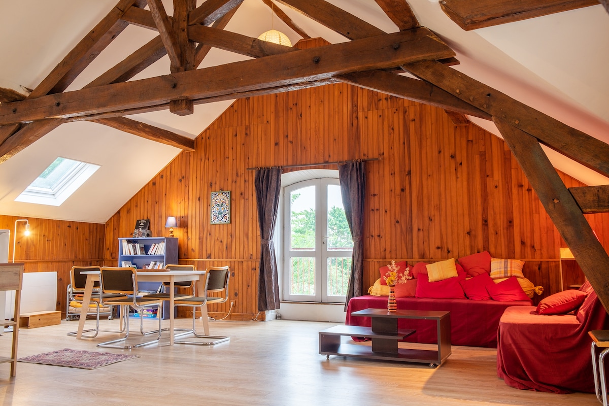 Välkommen till Grotte du Moulin! Denna naturliga loft är infälld i en kalkstenshög och kommer att överraska dig med dess öppenhet. Den består av ett stort kök öppet mot vardagsrummet och ett sovrum med badrum åtskilt av en skjutbar garageport. I sovrummet har du en dubbelsäng (160cm) och i vardagsrummet en enkelsäng (90cm) med en icke cabrioletsoffa som kan användas som en liten enkelsäng.