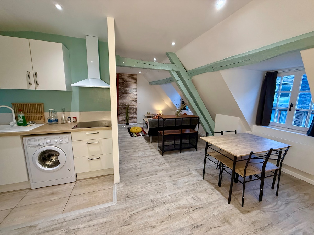 I hjärtat av staden, njut av min vackra varma lägenhet på 43 m², nära alla butiker. Den består av ett stort vardagsrum/vardagsrum, utrustat kök (mikrovågsugn, keramikhäll, brödrost, vattenkokare...), sovrum, badrum, dubbel dusch, toalett, tvättmaskin, wifi fiber, kaffepinnar, te och socker (Senseo kaffebryggare). Gratis parkering på gatan i närheten. Lakan, handdukar och väsentligheter tillhandahålls (utom duschtvål). Tidig incheckning och sen utcheckning med förbehåll för villkor.