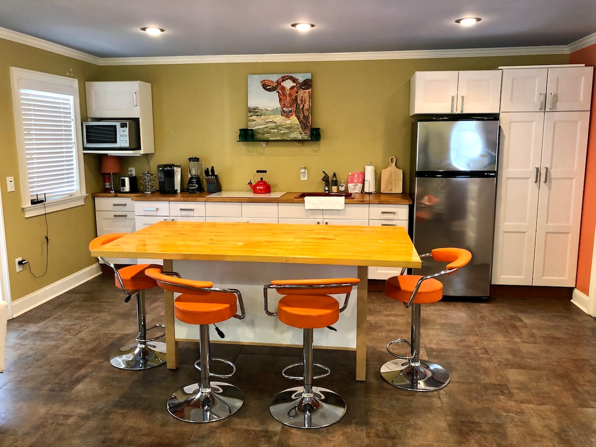 Detta charmiga gästhus med 2 sovrum har en dubbelsäng i varje sovrum, 1 badrum med ett antikt clawfoot badkar och en separat dusch. Vardagsrummet har en stor platt-TV och två små TV-apparater i sovrummen. I kokvrån finns kylskåp, handfat, kaffebryggare, mikrovågsugn, bestick och tallrikar i vintagestil. Det finns INGEN spis eller ugn. Men vi har en grill och picknickbord för matlagning utomhus. Gästhuset har en gemensam vägg med huvudhuset.