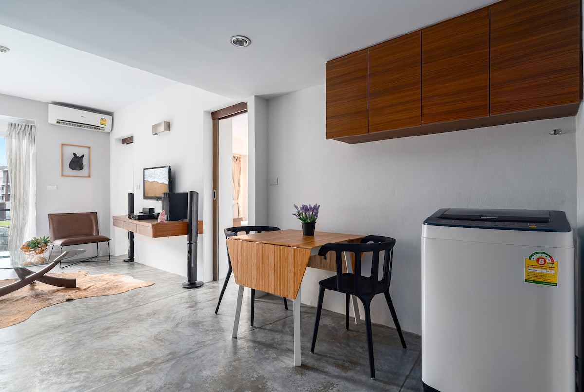 Fräsch 55 kvm 1-säng (INTE Studio!). 💤Sovplats för 3: King-säng (Ortho) + Lädersoffa. Premium 100 % bomullslakan. ⚡Teknik: Frontmatad tvättmaskin/torktumlare, diskmaskin, 2 stora smarta TV-apparater, 2 AC. 🏃Aktiv: Gym, Tennis, Streetball, 2 Pools, känd Mountain Hiking Trail. 📍Plats: 1 minut till Sea Shore (SUP-plats) och Jack's (Stylish Cafe). Gå till Fisherman's. ✨Utsikt: Stor balkong med bergsutsikt. Ljudisolerade fönster. 🚀Snabb WiFi via fiber. 🅿️Gratis parkering. 👮Säkerhet dygnet runt. 🌴Lyxig resort. Tyst. Inget flygplansbuller! 🔇✈️ Toppställe! 🏆