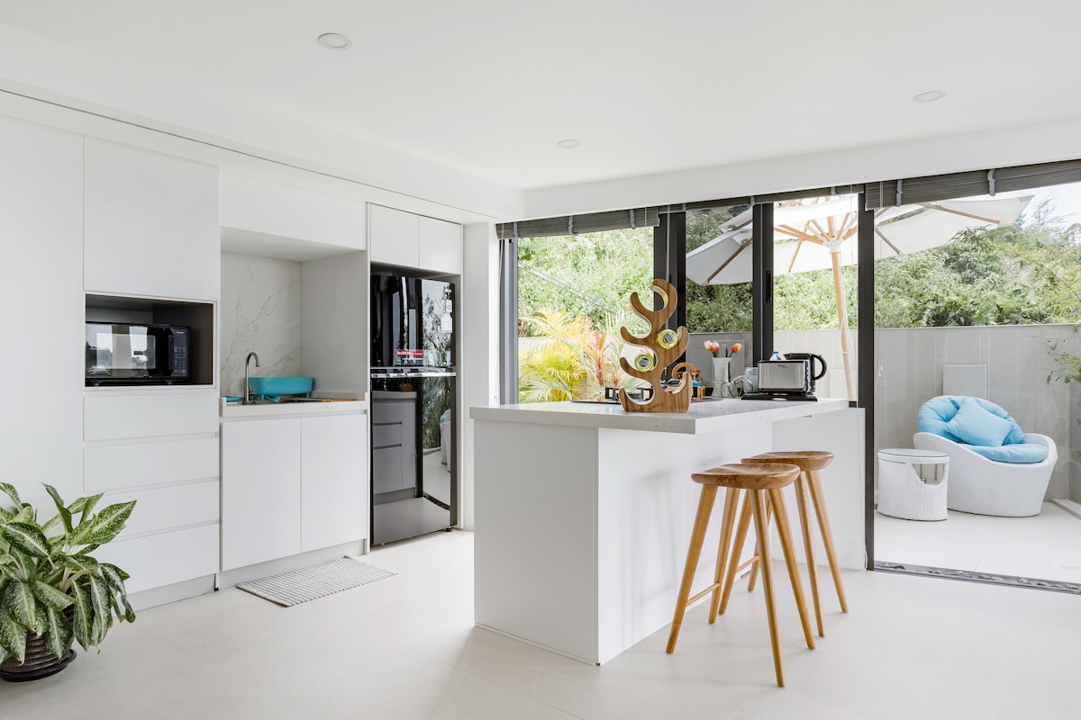 En elegant svit med högt i tak och en vacker jetplungepool med utsikt över havet, perfekt för avkoppling, stjärnskådning eller för att njuta av ett dopp i solnedgången. Inkluderar ett ljust sovrum, köksutrymme, balkong, Wi-Fi, parkering och gratis hämtning och avlämning på flygplatsen för vistelser på två nätter eller längre.