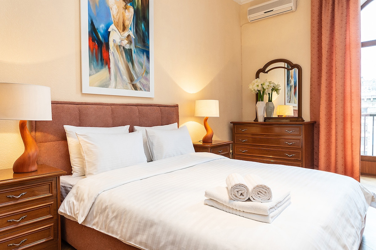 Obs: det finns alltid el och Internet i boendet. Rymlig 150 kvm lägenhet ligger i den vackra historiska delen av Kiev, mest centrala läget. Det är nyrenoverad lägenhet med alla nya och fräscha bekvämligheter för din bekväma vistelse. Det finns 2 luftkonditioneringsapparater: en i vardagsrummet och en i det största sovrummet. Lägenhet ligger på 5:e våningen (observera att det finns ingen hiss). 2 minuters promenad till National Opera House, 5 minuters promenad till Khreshatyk Street och Arena City.