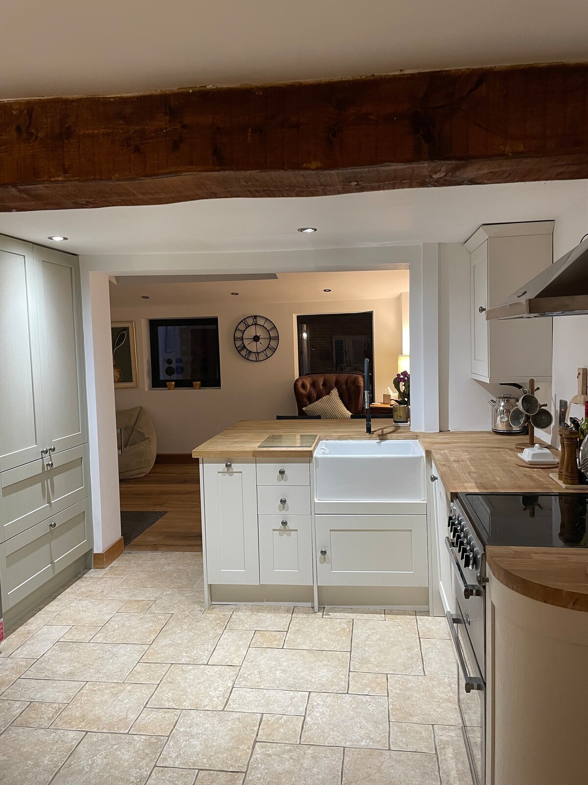 Rymlig omvandlad Cotswold-lada. Spel/Musik Lada med projektor och snooker bord. Inglenook öppen spis, spis, 2 trädgårdsområden med grillplats. Bubbelpool (extra). Perfekt för familjer, grupper, firanden eller affärer. För 16+ gäster, be om ett skräddarsytt pris. Rabatter för 3+ nätter. Priset inkluderar Airbnb-avgifter – be om en specifikation. Kan hyras med angränsande hus. Obs: Sovrum 3 och 4 bildar 1 stort badrum (7 enkelsängar + 1 queensize) via spiraltrappa.