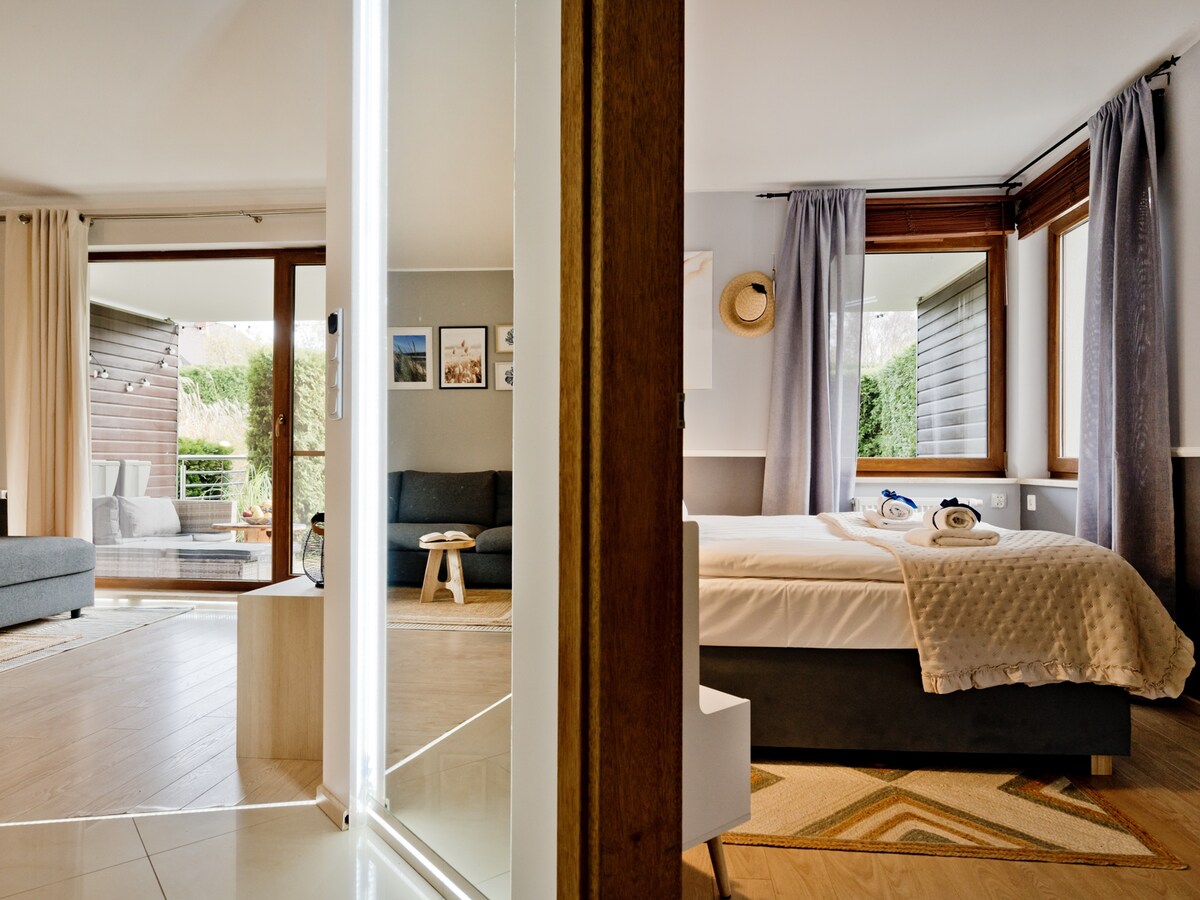De lux lägenhetshus – 2 sovrum, tillgång till jacuzzin, utrustat kök, lugnt grannskap. Perfekt för 4 personer. Plats: Stugan ligger i Jastrzębia Góra, i en lugn del – borta från folkmassorna, och samtidigt nära stranden (ca. 7 minuters promenad), butiker och restauranger. Läget är perfekt!