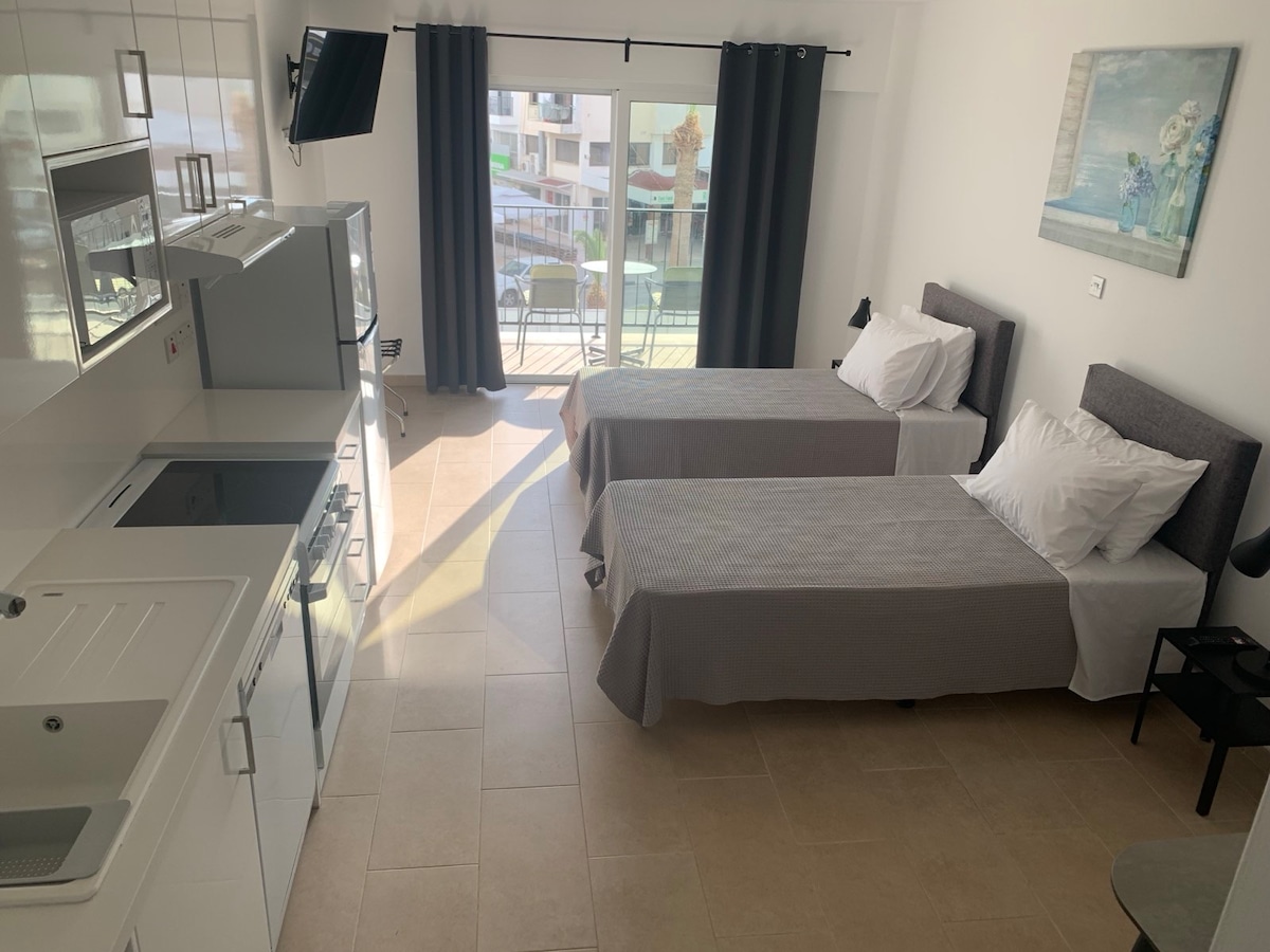 Njut av din flykt av det rutinmässiga livet i vår nya studio i Mykonos-stil med en härlig, liten trädgård precis bredvid en enorm pool och en sandstrand som erbjuder den mest fantastiska cypriotiska solnedgången! Du går in i din studio genom en separat ingång bredvid din privata lilla trädgård (sittgrupp/grill). Njut av en dubbelsäng och en mysig soffa eller tredje säng, eget badrum, och ett litet kök och matplats. Alla butiker och restauranger några steg att gå. Hamn, köpcentrum och nattliv och fler stränder 10 minuter med buss.