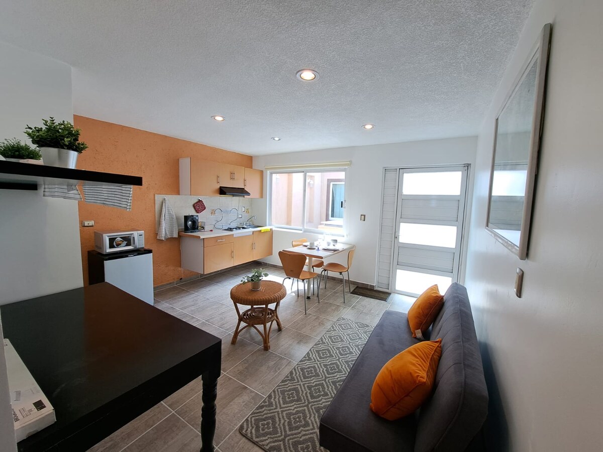Vår lägenhet har ett underbart läge - det kommer att bli mycket lätt att planera ditt besök! Du kommer att vara värd ett halvt kvarter från pyramiden i Cholula, inom en liten konstruktion med vår Gru Grú-restaurang och en andra lägenhet. Du kan njuta av en takträdgård med grill och hängmatta samt en elegant och underbar plats. Det är på en andra våning. Parkeringsplatsen ligger på gatan eller med grannen som tar 50 $ per natt. Husdjur kommer med en kostnad för boende