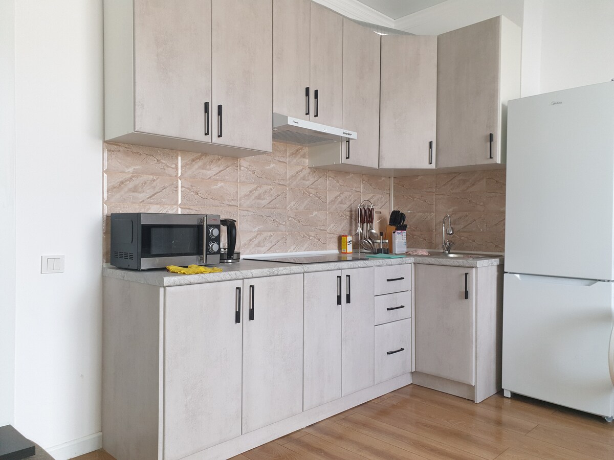 Lägenheten är mycket ljus,ren,mysig,hemtrevlig atmosfär,utmärkt renovering,vacker utsikt över sjön Issyk-Kul och Tien-Shan-bergen. I närheten finns Blue Issykul sanatorium,där du kan få hälsobehandling. I närheten finns också banker,apotek,sjukhus,butiker,marknader.