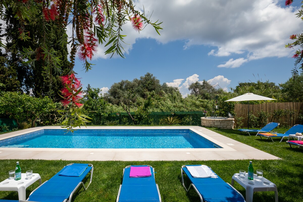 En helt ny lyxlägenhet, med fantastisk utsikt och trevlig soluppgång. Ostria lägenhet är en del av ett lantligt hus beläget på en 3 hektar självägd tomt, på en sluttning av en kulle, med en 220° öppen horisont och oändliga gröna landskap. Endast 4,5 km från Korfu stadens centrum. Ostria lägenhet består av en dubbelsäng med eget badrum med dusch, smart-TV, gratis Wi-Fi, fullt utrustat kök, tvättmaskin och privat parkering. Vackra privata trädgårdar